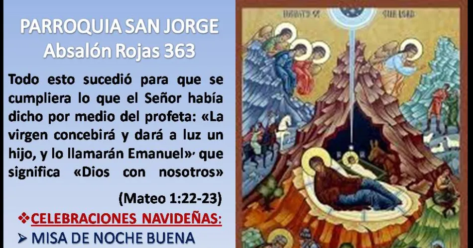 La Parroquia San Jorge, ubicada en Absalón Rojas 363, invita a toda la comunidad a participar de las celebraciones navideñas, conmemorando el nacimiento de Jesús, Emanuel, "Dios con nosotros".