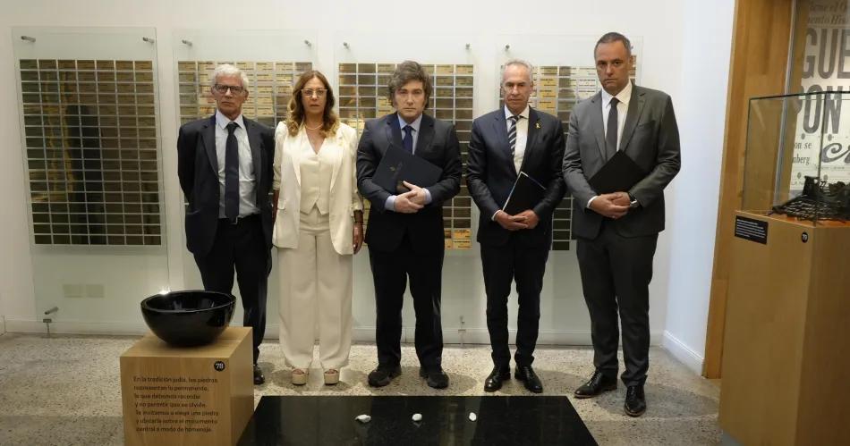 Milei se mostró acompañado del vocero presidencial, Manuel Adorni, y del ministro de Justicia, Mariano Cúneo Libarona. También estuvieron presentes en la ceremonia el secretario de Educación, Carlos Torrendell; el vicecanciller, Eduardo Bustamante, y el embajador de Israel en la Argentina, Eyal Sela.