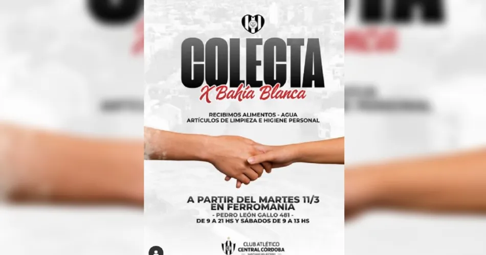 Se solicita a la comunidad santiagueña que colabore con alimentos no perecederos, agua mineral, artículos de limpieza e higiene personal para ayudar a los afectados por las inundaciones. Central Córdoba hace un llamado a la solidaridad y espera que todos los santiagueños se sumen a esta acción para brindar apoyo a las personas que atraviesan momentos muy difíciles en Bahía Blanca.
