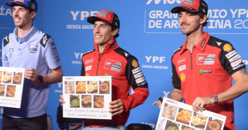 Los españoles Marc y Alex Márquez junto con el italiano Francisco Bagnaia, pilotos de MotoGP, encabezaron la conferencia de presentación del Gran Premio de la República Argentina que se correrá esta semana en Las Termas del Río Hondo. Durante el evento que fue transmitido en vivo por la organización y exclusivamente en inglés, los pilotos se sometieron a un simpático juego que propuso la organización, en el que los protagonistas tenían que adivinar y ordenar con números las fotos de comidas regionales.