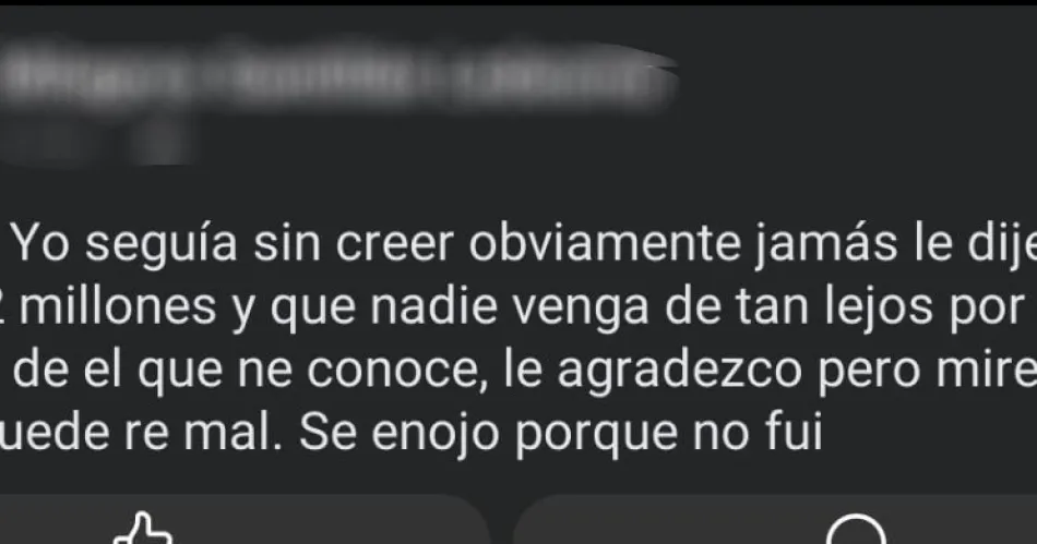Además, de la mujer que la señaló como una estafadora, apareció otro usuario quien manifestó lo siguiente: "Buen día, como están, alguna vez iba pasarme , alguna vez me iba a cruzar con gente mala, con personas que solo engañan y sacan réditos personales, días atrás compartí una publicación sobre una mujer que necesitaba plata para remedios y comenzar su quimio , resulta ser que es todo mentira !! Esta señorita mintió absolutamente todo !!! Por mp le he pedido los estudios, las derivaciones etc, jamás, pero jamás me mando, tengo un audio donde me dice , casi moribunda " estoy con sonda , no puedo hablar " al otro día se sacó la sonda y se curó prácticamente.