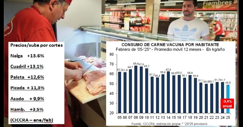 El consumo de carne vacuna creció un 13,1% en el bimestre enero-febrero frente al mismo periodo de 2024, a pesar del notorio incremento en los precios, aunque el consumo per cápita continúa en un piso histórico de 48,8 kilogramos de acuerdo a lo informado por la Cámara de la Industria y el Comercio de Carnes y Derivados de la República Argentina (CICCRA).
