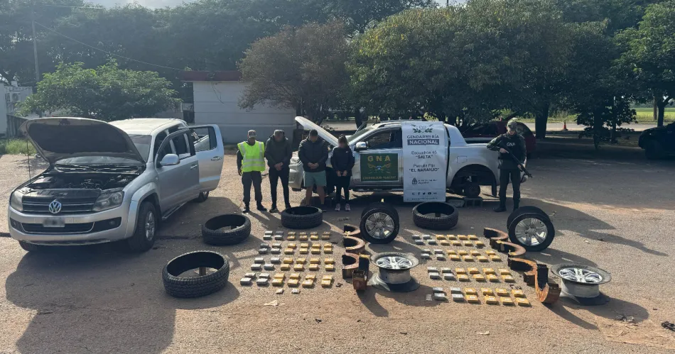 En un operativo montado en la intersección de la Ruta Nacional N° 9 y 34, a la altura del kilómetro 1.439, en la Patrulla Fija "El Naranjo", los gendarmes detuvieron la marcha de dos camionetas sospechosas y detectaron que una de ellas ocultaba 96 paquetes rectangulares y dos envoltorios amorfos con en el interior de las cubiertas que, tras las pruebas arrojaron resultado positivo para cocaína con un peso total de 50. kilos 932 gramos.