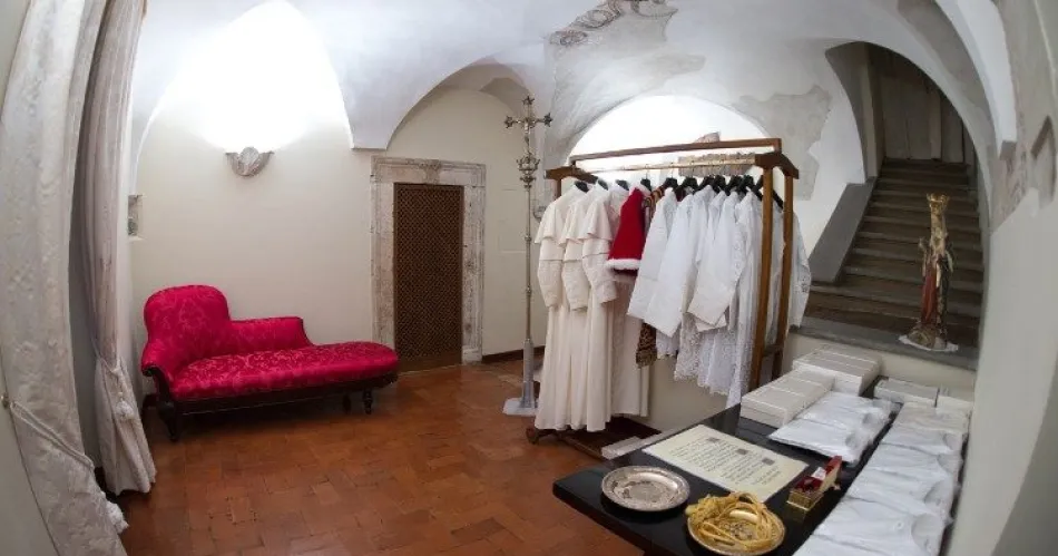 Una vez que entra el nuevo Pontífice le esperan las túnicas papales, en tres tallas por si acaso, una estola blanca, zapatos nuevos y un espejo. Aunque este momento se vive en soledad, si se requiere puede tener asistentes que lo ayuden a vestirse.