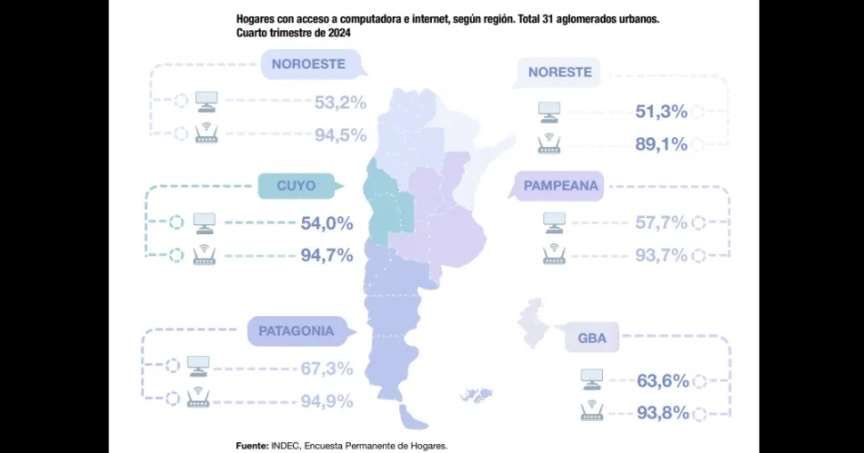 Por otra parte, "el acceso a la computadora se redujo durante los últimos cinco años, varió de 63,8% en 2020 a 60,3% en 2024". Puntualizó que "en los aglomerados de menos de 500.000 habitantes, la diferencia de acceso a internet en relación con el acceso a las computadoras es aún mayor que el promedio nacional: 34,9 p.p". Las regiones de Patagonia y Cuyo registran el mayor acceso de los hogares a internet, 94,9% y 94,7%, respectivamente.