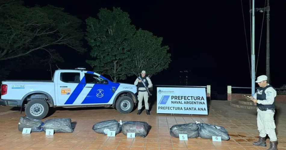 El procedimiento tuvo lugar en la noche del domingo, a la altura del kilómetro 1.612 del río Paraná. Allí, personal de la fuerza detectó mediante visor nocturno una embarcación a remo que cruzaba desde la costa paraguaya por un paso no habilitado. Al dirigirse al lugar, los prefectos hallaron el bote abandonado en territorio argentino con seis bolsones en su interior.