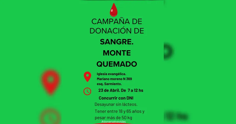 El Ministerio de Salud de Santiago del Estero, y el Hospital Zonal de Monte Quemado, invita a toda la comunidad a participar de una importante jornada de donación de sangre que se llevará a cabo el próximo jueves 23 de mayo, de 7:00 a 12:00 horas, en la Iglesia Bautista de Monte Quemado.