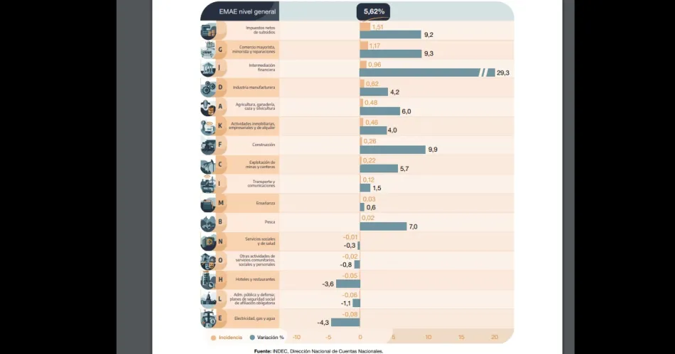 Con relación a igual mes de 2024, diez sectores de actividad que conforman el EMAE registraron subas en marzo, entre los que se destacan Intermediación financiera (29,3% ia) y Construcción (9,9% ia). La actividad de Comercio mayorista, minorista y reparaciones (9,3% ia) fue la de mayor incidencia positiva en la variación interanual del EMAE, seguida de Intermediación financiera (29,3% ia) e Industria manufacturera (4,2% ia).