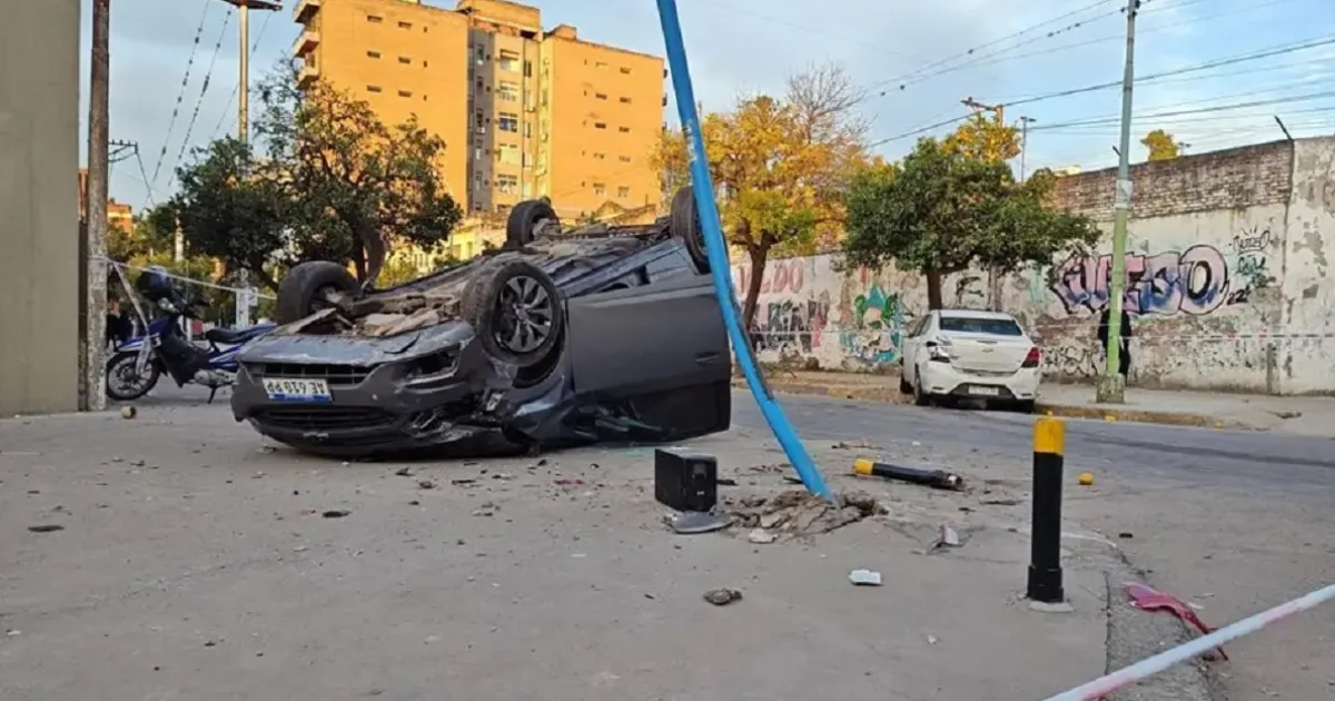 El accidente se produjo minutos después de las 7, cuando un Chevrolet Onix gris que circulaba por Rivadavia en dirección al centro colisionó con un Chevrolet Prisma blanco que lo hacía por España hacia el este. La fuerza del impacto fue tal que el Onix dio una vuelta de campana y terminó volcado sobre su techo, en la acera, muy cerca del cuarto de círculo de la esquina.