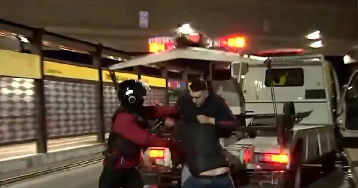 La confrontación escaló rápidamente y la pelea se trasladó al medio de la avenida Juan B. Justo, donde los tres implicados se tomaron a golpes de puño, mientras los vehículos que transitaban por la arteria intentaban esquivarlos. Inmediatamente, móviles de la Policía de la Ciudad se hicieron presentes en el lugar. Los uniformados intervinieron para separar a los individuos y demorarlos.