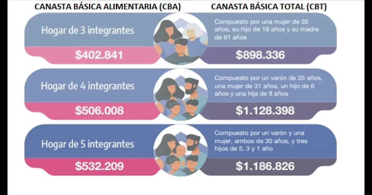 CBT El Valor de la Canasta Básica Total superó los $1,1 millones para una familia tipo. La Alimentaria, más de medio millón. ingresos