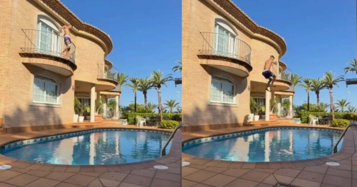 En las imágenes que él mismo difundió desde sus redes sociales, se lo puede ver corriendo alrededor de la pileta para ingresar a la casa. Una vez allí, se asoma al balcón que da justo arriba de la piscina para pasar la reja y tirarse sin ningún tipo de protección.