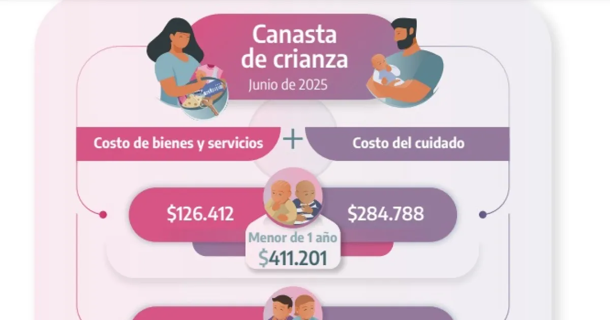 El INDEC presentó los datos de las canastas de crianza de entre 0 a 12 años que incluye el costo mensual para adquirir los bienes y el costo de cuidado. Para un menor de un año, la canasta cerró en $411.201: $126.412 de bienes y servicios y $284.788 por gastos de cuidado. Con respecto a mayo, subió 0,14%. En niños de 1 a 3 años, el costo total fue de $488.700: $163.228 por bienes y servicios, y $325.473 en costos del cuidado. Subió un 0,16%. En la crianza de 4 a 5 años, el costo se mantuvo equiparado con el de un bebé, a $411.310. De allí, $207.890 de costos de bienes y servicios y $203.420 costos del cuidado. Por mes, subió un 0,24% con respecto a mayo. La canasta para niños entre 6 y 12 años cerró en $517.364: del total, $257.888 para bienes y servicios y $259.476, de cuidados. Con respecto a mayo, subió lo mismo que la de 4 y 5 años: 0,24% mensual.