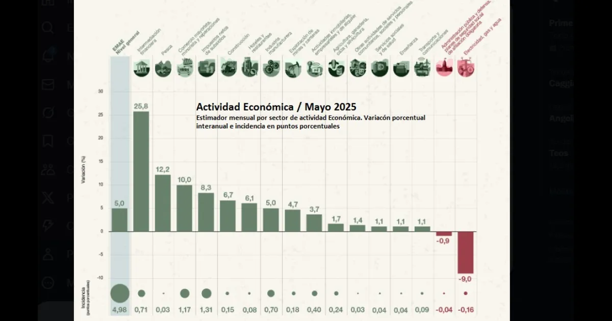 Con respecto a las subas, 13 de los sectores de actividad aumentaron en mayo, entre ellos Intermediación Financiera (25,8%) e Industria manufacturera (5%) como los que más subieron con relación a igual mes del 2024. A pesar de haber registrado una leve caída en el indicador mensual, el ministro de Economía Luis Caputo aseveró que, frente a la corrección de los 12 meses anteriores, genera que la medición desestacionalizada "quede en el mismo nivel que tenía en abril pasado".