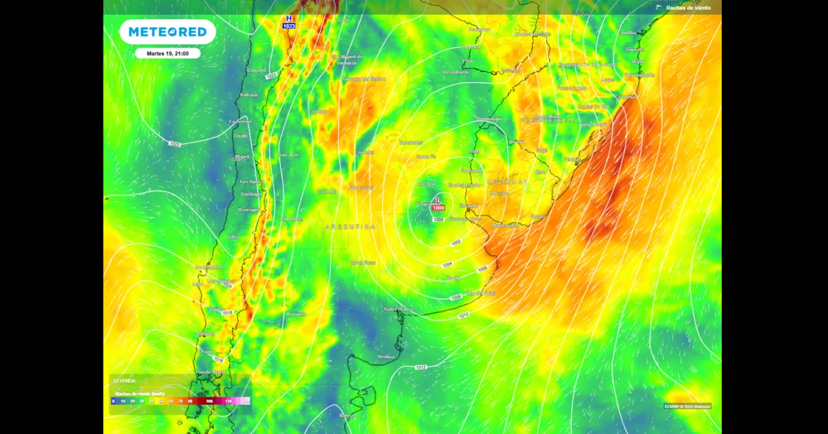 La situación más intensa se espera para el martes 19, cuando el sistema alcance su etapa más desarrollada. Ese día, un profundo centro de bajas presiones se desplazará desde el centro del Litoral hacia el sudeste bonaerense, generando precipitaciones generalizadas y viento intenso en gran parte del centro del país.