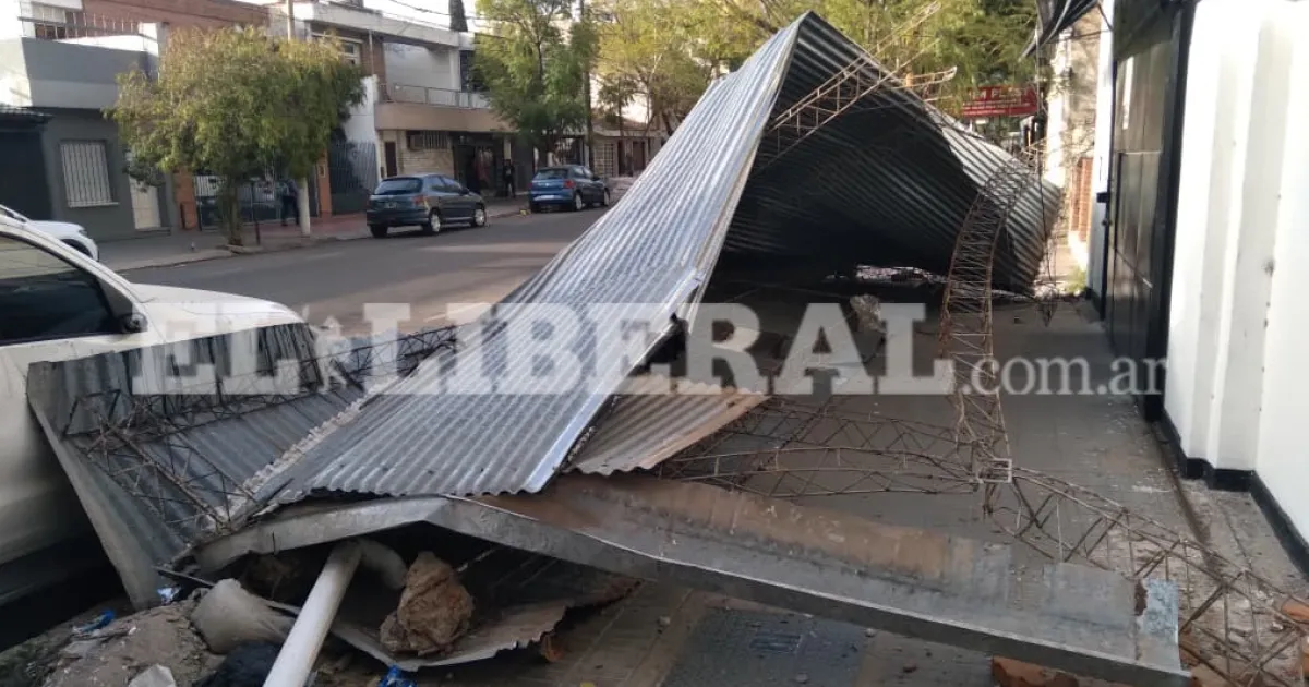Testigos señalaron que el tinglado no resistió la fuerza de los vientos y terminó cayendo sobre parte de la vereda y la calle, provocando temor entre los vecinos y transeúntes.