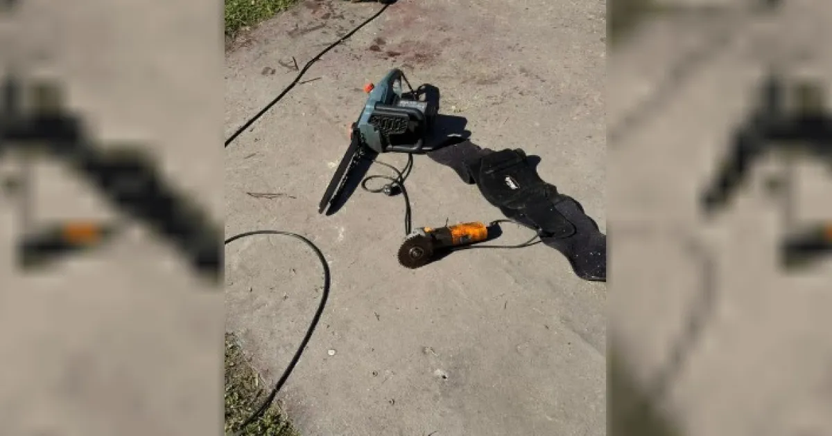 A pocos metros, los oficiales localizaron varias herramientas, entre ellas una amoladora de mano con disco de corte para madera, que presentaba manchas de sangre junto a una motosierra.