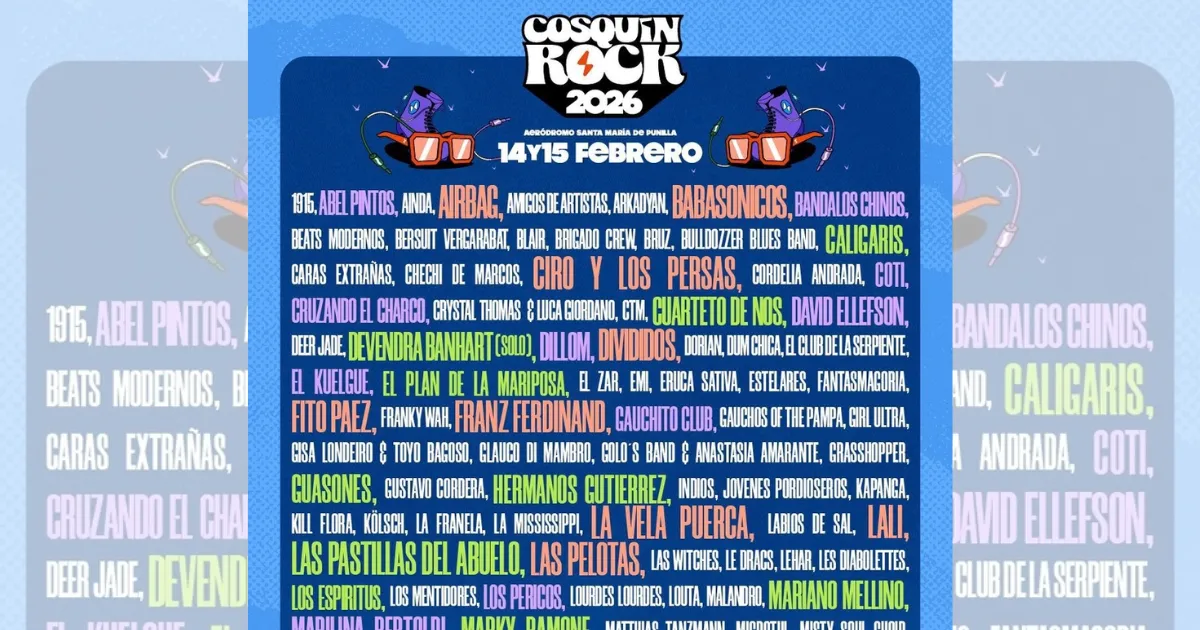 La espera terminó. El festival Cosquín Rock confirmó la grilla de artistas que se presentarán el 14 y 15 de febrero de 2026 en Córdoba. Abel Pintos, Bersuit Vergarabat, Marilina Bertoldi, Babasónicos, Divididos, Dillom, Turf, Kapanga, Ciro y Los Persas, Los Pericos y Fito Páez son algunos de los músicos destacados. Asimismo, los nombres internacionales que brillarán en los escenarios dela localidad de Punilla son Franz Ferdinand, Morat, Los Hermanos Gutiérrez, Devendra Banhart, La Vela Puerca, y Agarrate Catalina.