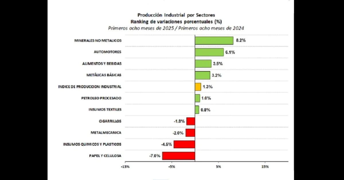 El relevamiento apunta que entre los rubros más afectados se ubicaron la producción automotriz, los minerales no metálicos y las autopartes. En el caso del cemento, los despachos registraron la segunda caída interanual, con un retroceso marcado en las ventas en bolsa. Según FIEL, los sectores líderes de la recuperación industrial evidenciaron nuevos frenos en agosto, mientras que alimentos y bebidas moderaron su ritmo de crecimiento.