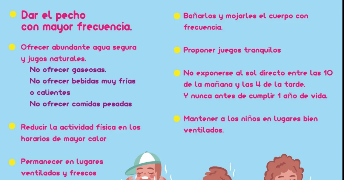 En ese sentido, sugirió a los adultos estar atentos, más que nunca, a los niños y "ofrecerles agua frecuentemente, aunque no la pidan. En el caso de los bebés, darle pecho a demanda. Hay que evitar sol entre 10 y 17 horas; y buscar sombra y ventilación".