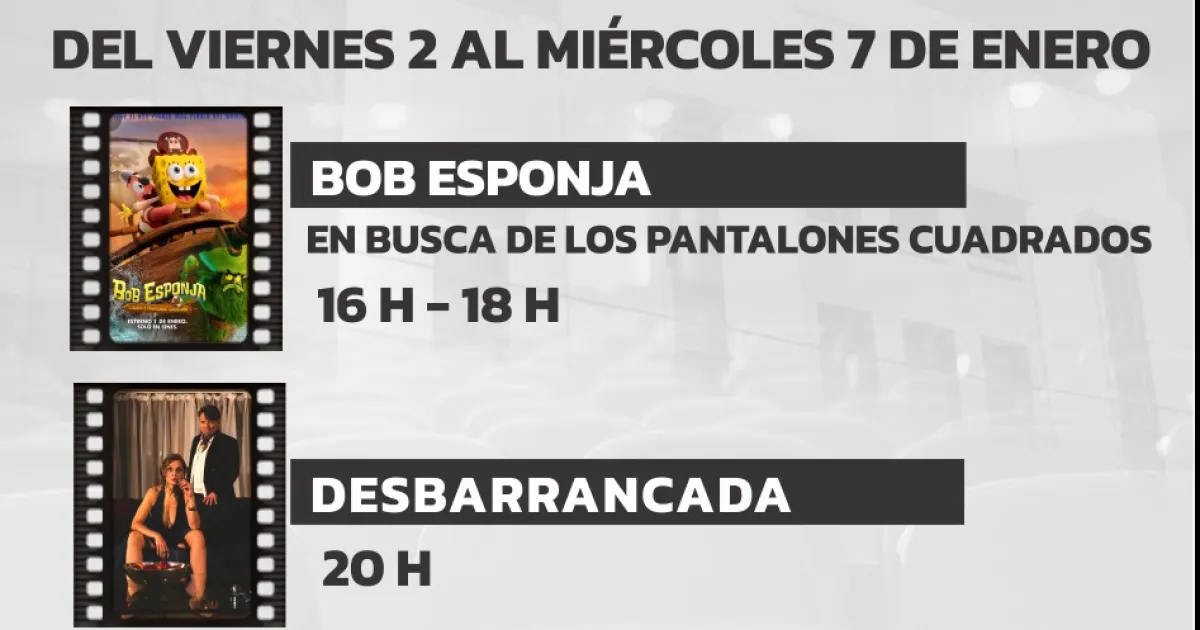 Dentro de la cartelera se destaca la proyección de "Bob Esponja en busca de los pantalones cuadrados", una opción ideal para el público infantil y familiar, que se exhibirá todos los días a las 16:00 y 18:00 horas. La película invita a vivir una divertida aventura junto a Bob Esponja y sus amigos, quienes se embarcan en una misión llena de humor y situaciones disparatadas para recuperar los famosos pantalones cuadrados.