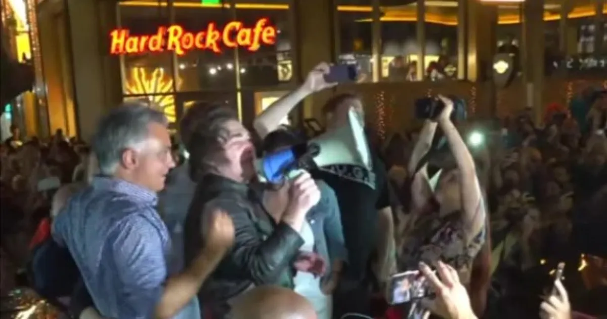 Lo que comenzó como un saludo protocolar derivó rápidamente en un desborde de simpatizantes. La custodia presidencial se vio superada y el vehículo que transportaba a Milei quedó atrapado entre la multitud. Ante la imposibilidad de continuar la marcha, el Presidente se paró en la caja del vehículo y tomó un megáfono para dirigirse a los presentes.