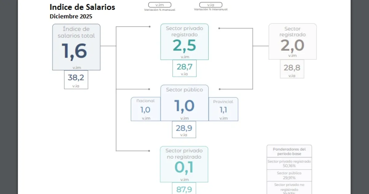 Los salarios privados subieron en diciembre 2,5% y los públicos 1%. La inflación del último mes de 2025 fue de 2,8%. El retroceso anual se explicó íntegramente por la merma registrada durante el último cuatrimestre del año. El salario en negro o no registrado, creció 0,1% en diciembre con lo cual también perdió con la inflación del mes.