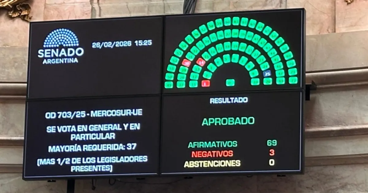 El Congreso de la Nación Argentina aprobó este jueves el tratado comercial interino entre el Mercosur y la Unión Europea, un paso clave en un proceso que lleva décadas de negociación y que aspira a impulsar el comercio entre ambos bloques. La iniciativa logró un respaldo contundente en el Senado, donde fue ratificada con 69 votos a favor y apenas 3 en contra.