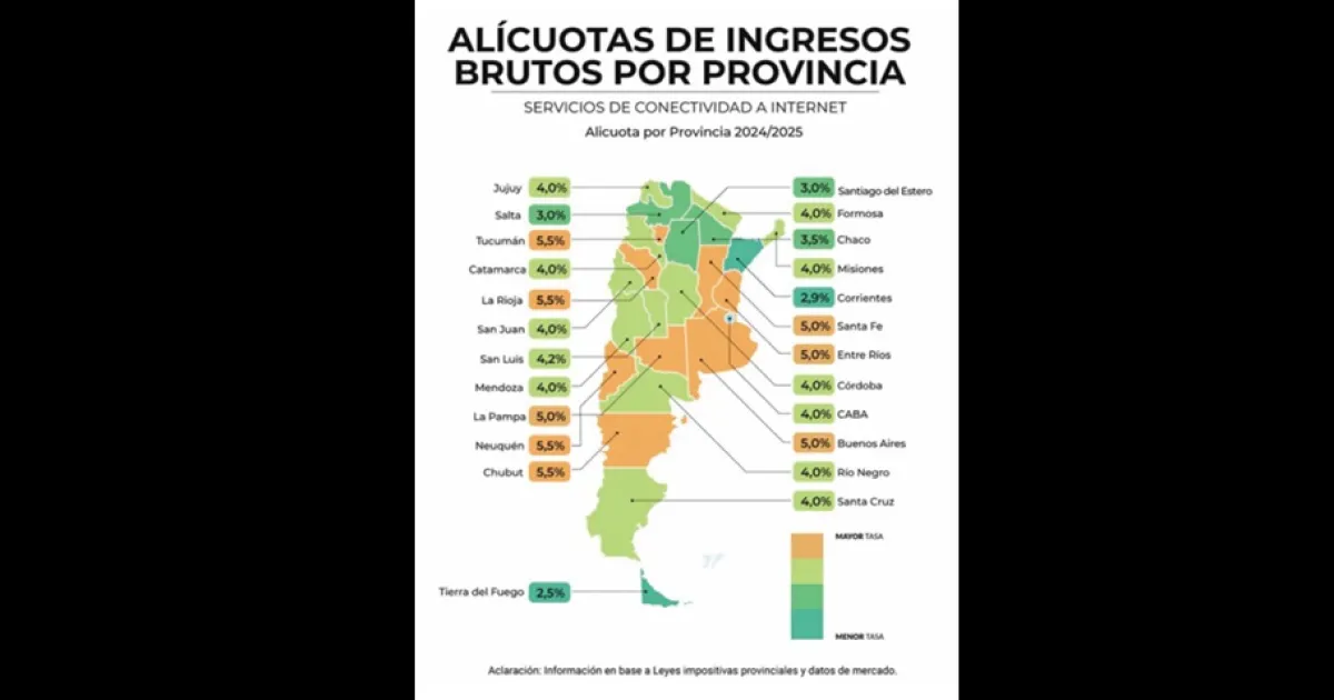Solo Corrientes con el 2,9% y Tierra del Fuego con 2,5%, reflejan una tasa menor y Salta una alícuota igual a la de Santiago del 3%. Todo el resto de las provincias cobran Ingresos Brutos con alícuotas mayores a las que aplica Santiago del Estero por ejemplo en un rubro clave como lo es el servicio de conectividad a internet.