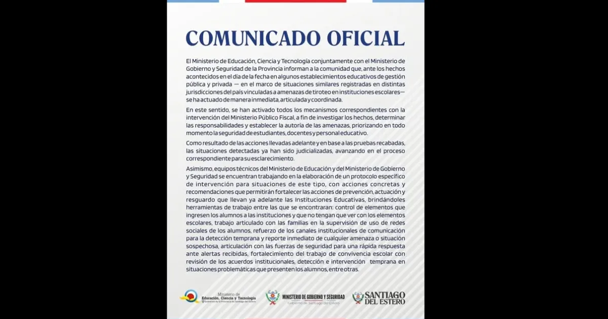 Ante los recientes episodios de amenazas en establecimientos educativos de Santiago del Estero, a través de un comunicado, el Ministerio de Educación, Ciencia y Tecnología junto al Ministerio de Gobierno y Seguridad informaron que se activaron de inmediato mecanismos de intervención para garantizar la seguridad de la comunidad escolar.