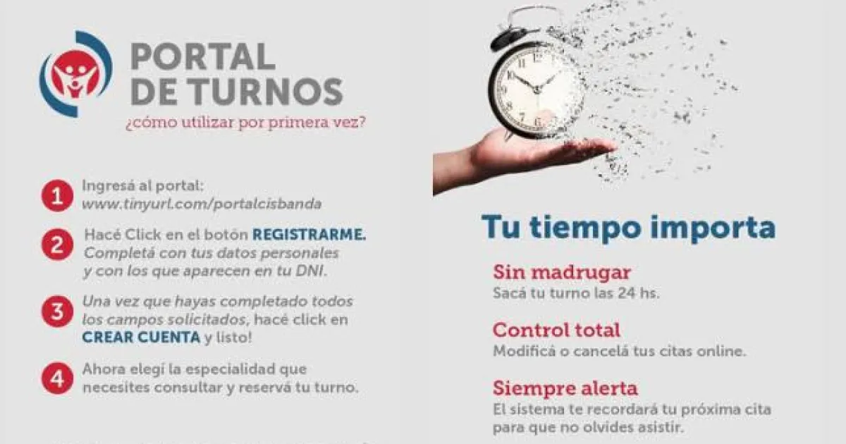 Desde el centro de salud se informó que todos los pacientes que necesitan turno de cualquier tipo de atención que se ofrece en el nosocomio, lo puede gestionar al instante entrando al sitio https://tinyurl.com/ portalcisbanda.