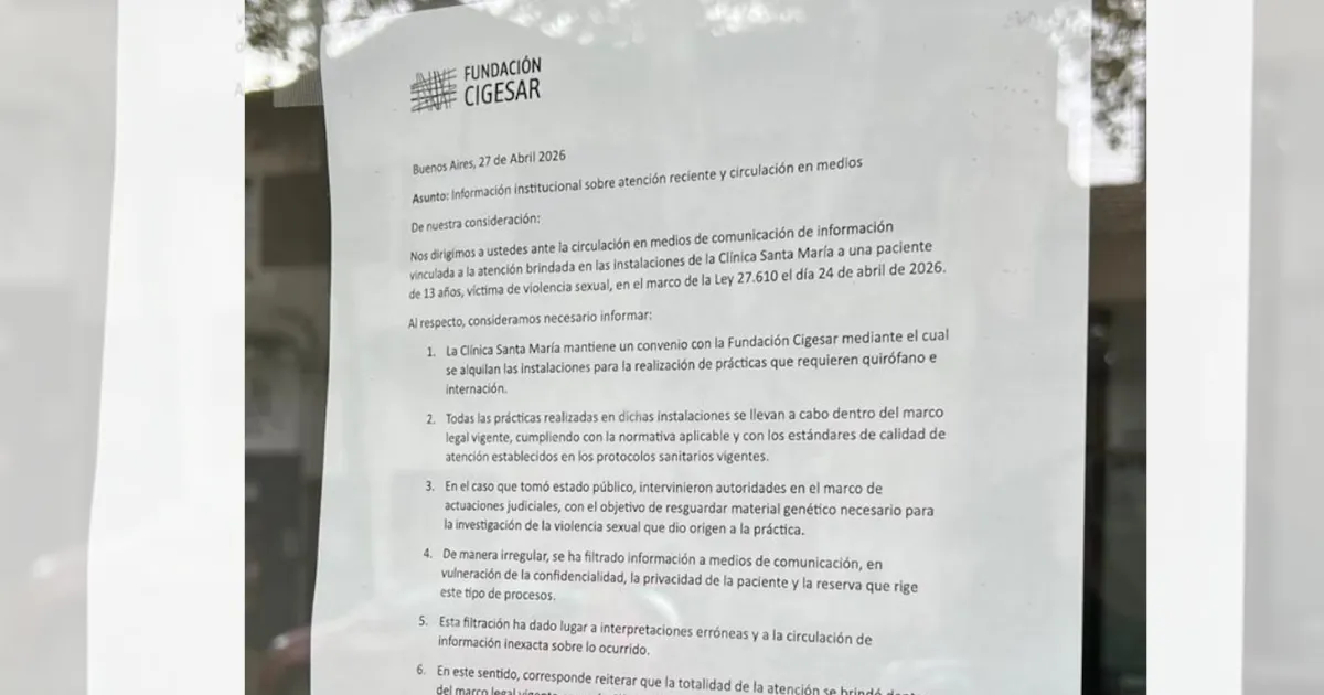 La Fundación Cígesar, que es investigada por el presunto pago del viaje de la adolescente santiagueña, oriunda de Monte Quemado, embarazada tras una violación y su mamá hacia Buenos Aires, sacó un comunicado donde confirmó que mantiene un convenio con la Clínica Santa María en Villa Ballester.