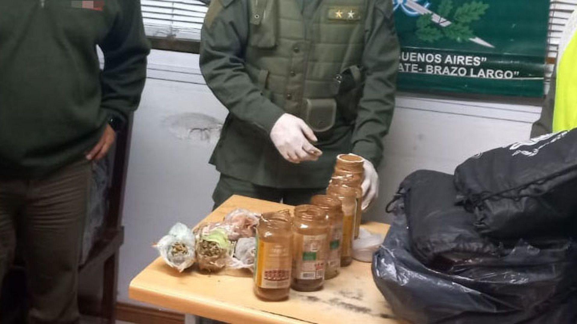 Al momento de la inspección del rodado, los funcionarios fueron alertados por nueve encomiendas que fueron registradas por orientación judicial. La requisa resultó en el hallazgo de 505 gramos de cogollos de marihuana ocultos en frascos de café y de 27 kilos 900 gramos de hojas de coca en estado natural acondicionada en paquetes.