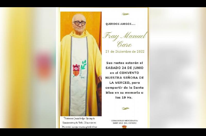 Este sábado 24 de junio se llevará a cabo la Santa Misa con las cenizas del padre Manuel Caro en la Iglesia La Merced de la ciudad Capital, por lo que se invita a toda la comunidad religiosa a participar de la misma a partir de las 19 horas.