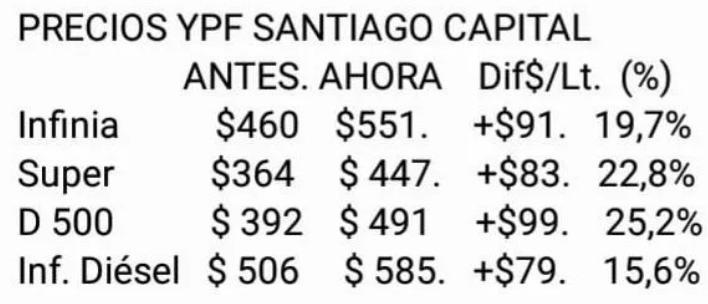 Los nuevos precios de los combustibles de YPF por litro en la Capital santiagueña en el caso de las naftas son de $447 en la Súper (antes $364) y de $551 la Infinia (antes $460). En el gasoil, el D500 subió a $491 el litro (antes $392), el Diesel Infinia a $585 (antes $506).