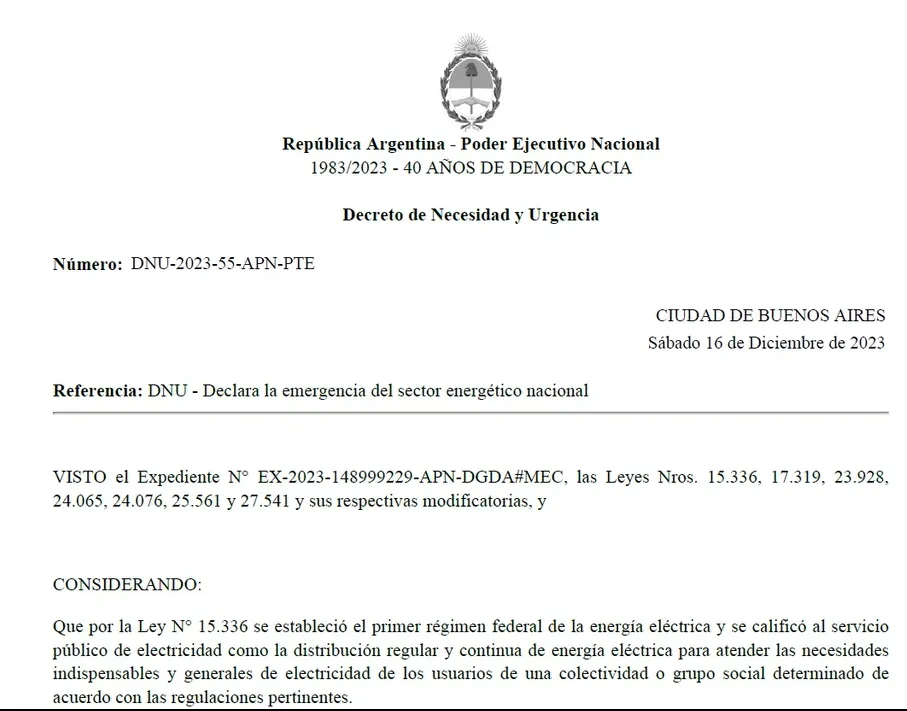 El DNU establece que la entrada en vigencia de los cuadros tarifarios resultantes no podrá exceder del 31 de diciembre de 2024.