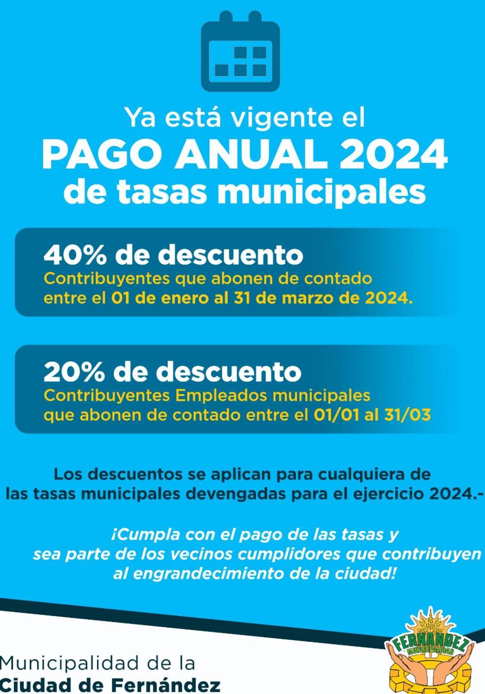 La Municipalidad de la Ciudad de Fernández, a través de la Secretaría de Economía y Hacienda, puso en vigencia el pago anual adelantado de las tasas que se abonan en Rentas Municipal. Los contribuyentes podrán acceder a importantes descuentos y el plazo de pago es desde el 1 de enero al 31 de marzo del corriente año.