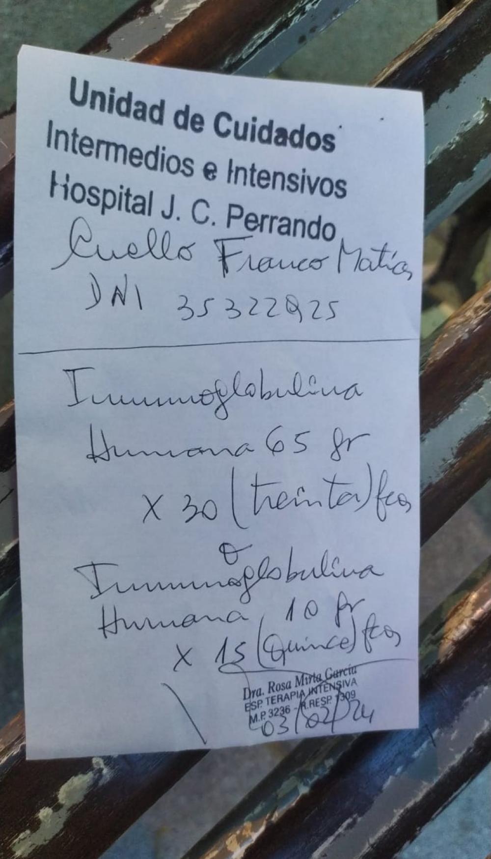 Josefa explicó que el tratamiento requiere de un medicamento llamado inmunoglobulina G humana. "La ley 26.689 garantiza el acceso a la misma, pero en este caso el hospital no se está haciendo cargo ya que no cuentan con los fondos suficientes y por ende mi familia, nosotros, tenemos que conseguirla por nuestros propios medios".