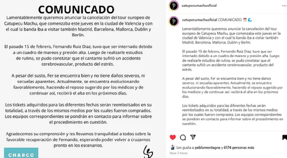 Para llevar tranquilidad a sus seguidores, detallaron que "se encuentra bien y no tiene daños severos ni secuelas aparentes", aunque decidieron cancelar la gira que la banda pensaba hacer por Europa hasta que el cantante se pueda recuperar por completo.