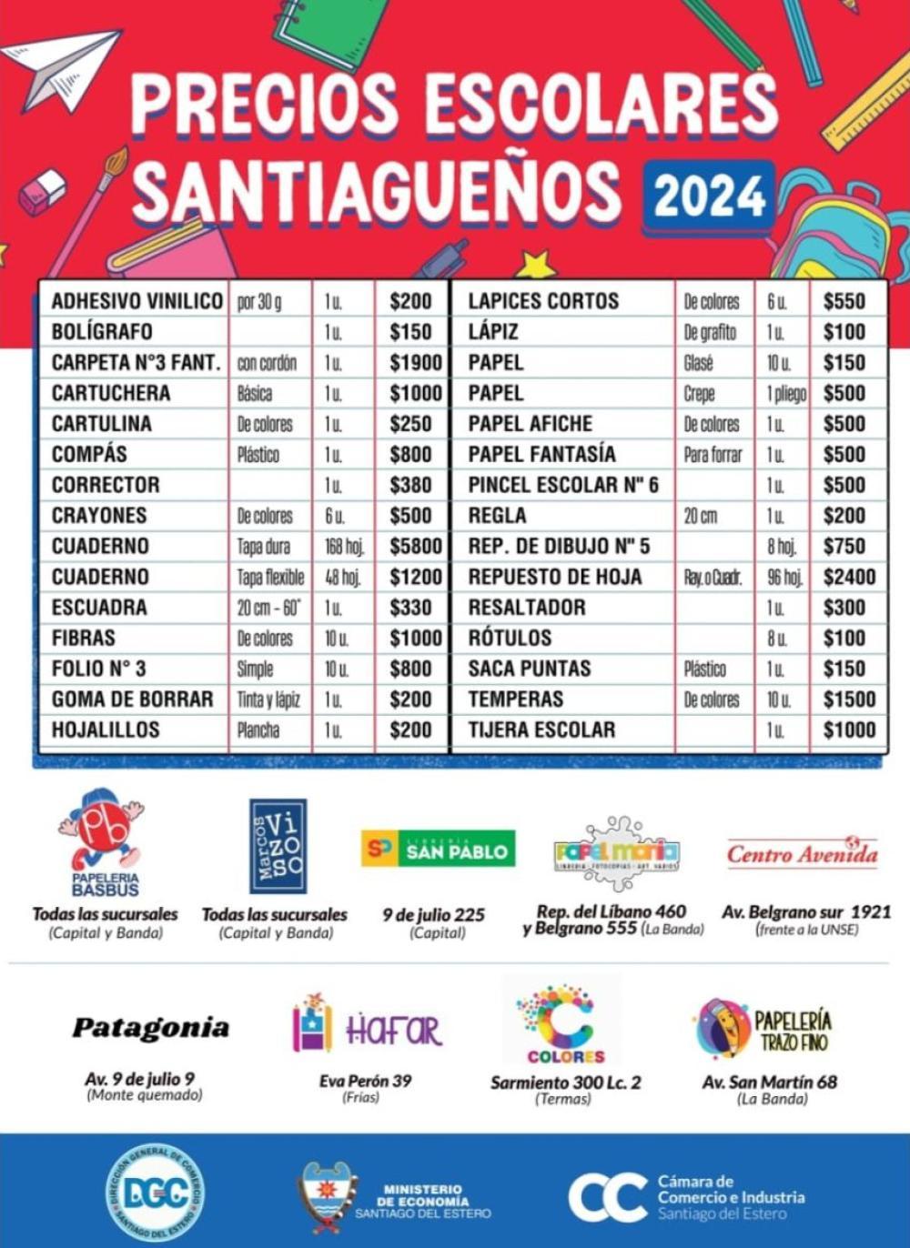 El Gobierno de la provincia, a través del Ministerio de Economía, dio a conocer el listado de Precios Escolares Santiagueños sugeridos, que está compuesto por 30 artículos que estarán disponibles desde este martes 20 hasta el 5 de marzo en establecimientos comerciales adheridos de ciudad Capital, La Banda, Frías, Las Termas y Monte Quemado.