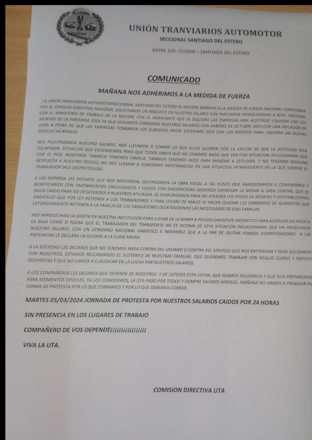 "La UTA Santiago del Estero se adhiere mañana a la medida de fuerza nacional convocada por el Consejo Directivo Nacional, solicitando un reajuste en nuestro salario con paritarias homologadas a nivel nacional con el Ministerio de Trabajo de la Nación, con el agravante que ni siquiera las empresas han aceptado liquidar con los montos de la paritaria 2023 ya que seguimos cobrando nuestros salarios con haberes de octubre 2023 con una inflación de 150%, a pesar de que las empresas cobraronlos subsidios hasta diciembre 2023 con los montos para liquidar las nuevas escalas salariales", dice el comunicado difundido por el sector de la UTA dirigido por Jorge Pacheco.