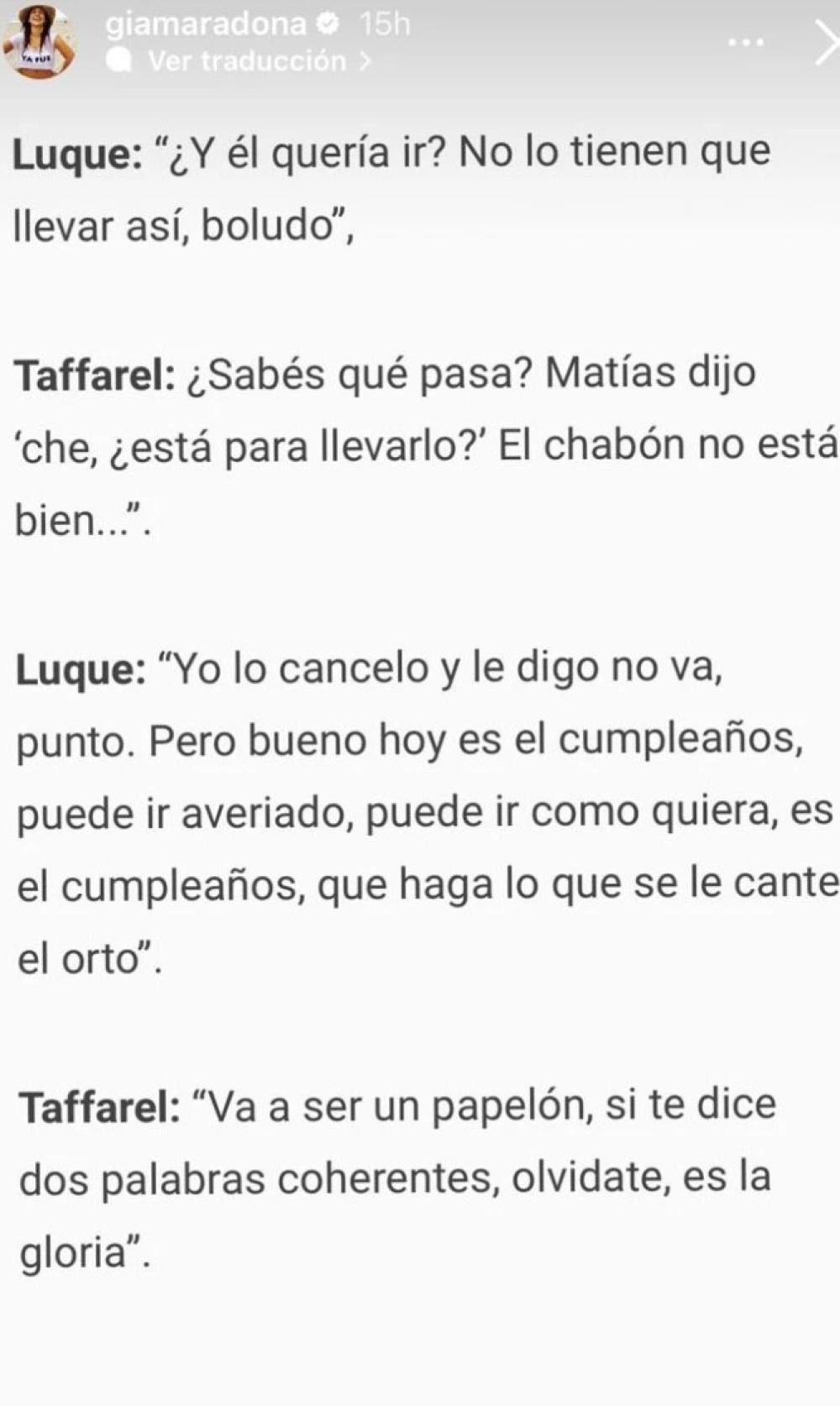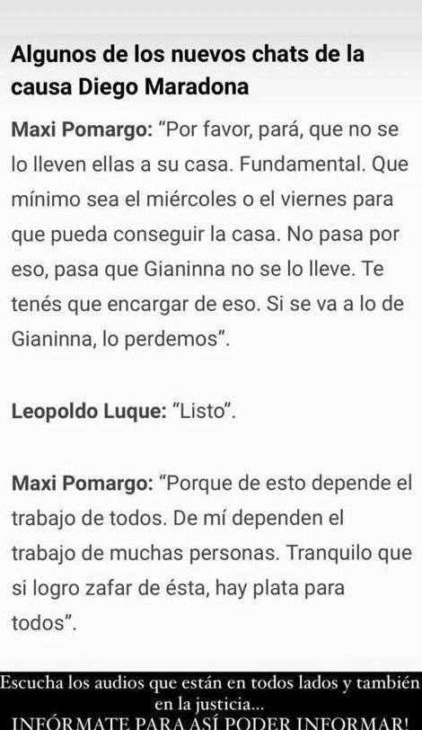 Aquella tarde quedó en el recuerdo por el estado del mejor jugador de todos los tiempos. En los chats que mostró se puede percibir que su semblante distaba del ideal. Así se puede leer a Luque: "¿Él quería ir? No lo tienen que llevar así".
