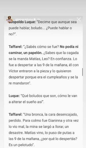 Dalma Maradona salió al tapete público para exhibir una serie de mensajes privados desconocidos hasta el momento, que se enviaron Leopoldo Luque y Nicolás Tafarel y que refieren al día de su cumpleaños de sesenta, la jornada en la que asistió al estadio de Gimnasia y Esgrima La Plata.
