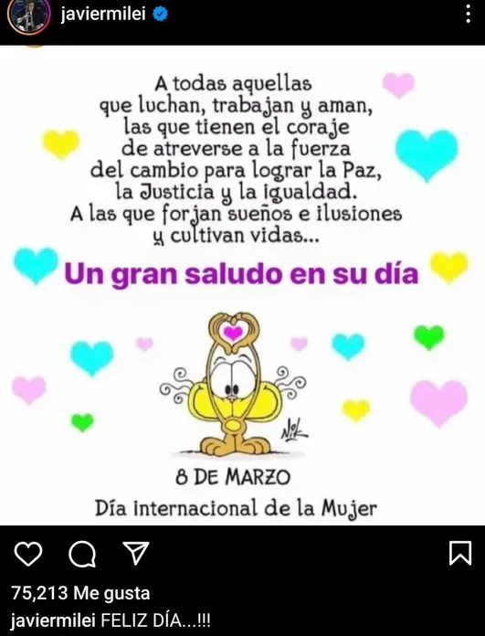 El presidente Javier Milei envió hoy un polémico saludo en el marco del Día Internacional de las Mujeres a través de sus redes sociales. Para el mensaje utilizó una imagen del ilustrador Nik Gaturro, alineado con la administración libertaria, y prepara un anuncio controversial respecto al futuro del Salón de las Mujeres de Casa Rosada.