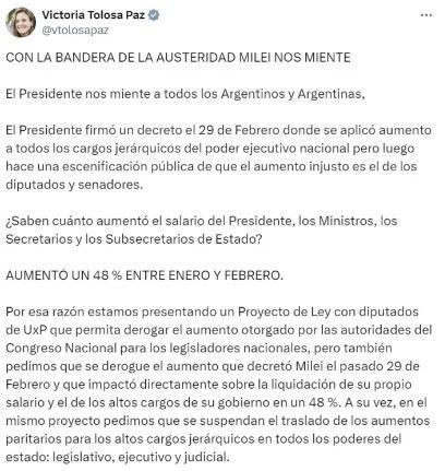 "Con la bandera de la austeridad, Milei nos miente. El Presidente nos miente a todos los argentinos. El Presidente firmó un decreto el 29 de Febrero donde se aplicó aumento a todos los cargos jerárquicos del Poder Ejecutivo nacional pero luego hace una escenificación pública de que el aumento injusto es el de los diputados y senadores", lanzó Tolosa Paz en redes sociales.