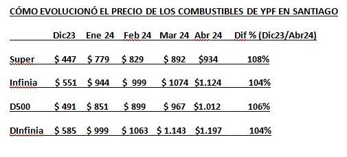 El precio de los combustibles de YPF registra un alza de 4,6% desde los primeros minutos de este lunes 1 de abril en Santiago del Estero con lo cual el litro de nafta Súper en los surtidores de la petrolera estatal llegó a $934 mientras que la versión Infinia del mismo combustible alcanzó los $1.124.