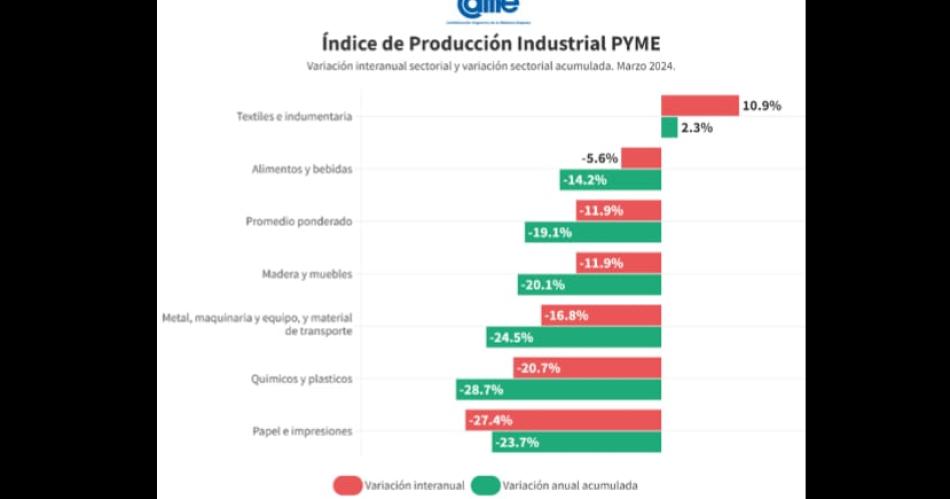 Cinco de los seis sectores manufactureros del segmento pyme tuvieron fuertes caídas en la comparación anual, siendo los más afectados "Papel e Impresiones" (-27,4%) y "Químicos y plásticos" (-20,7%). "Textil e indumentaria" fue el único rubro en alza (+10,9%).