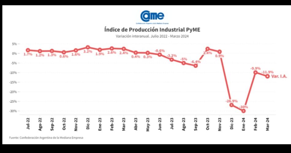 La actividad del sector manufacturero pyme registró en marzo una caída anual del 11,9%, experimentando así un nuevo descenso. A su vez, en el primer trimestre del año, la producción industrial acumuló una baja del 19,1% en comparación con el mismo período de 2023.