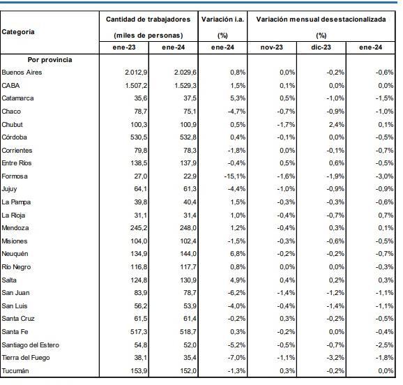 En tanto entre las que mayores caídas tuvieron en forma interanual se encuentran Formosa (-15% / - 4.100 empleos), Tierra del Fuego (-7% /- 2.700 puestos), San Juan (-6,2%/ -5.200), Santiago del Estero (-5,2% / -2.800), Chaco (-4,7% / -3600), San Luis (-4% / -2.300), Jujuy (-4,4% / -2800 ), Corrientes (-1,8% / -1.500),Misiones (-1,5% / -1.600), Tucumán (-1,3% / -1.900), Entre Rios (-0,4% / -600), Santa Cruz (-0,2%/-100).