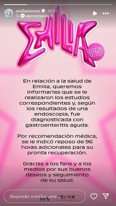 En medio de un hermetismo inicial tras su repentina internación, la producción de la artista reveló detalles de su estado. Emilia fue sometida a una endoscopia que le diagnosticó que padece una gastroenteritis aguda, lo que requerirá un período de reposo para su total recuperación.
